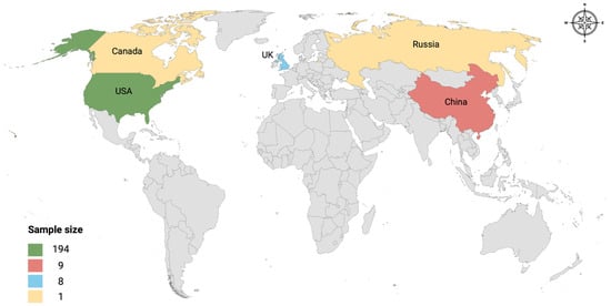 A total of 217 metagenomic sequence datasets were initially identified through a comprehensive literature search. However, 4 samples were excluded due to errors with the associated FastQ files. This resulted in a final dataset of 213 metagenomic sequences retrieved from 10 studies [25,26,27,28,29,30,31,32,33,34]. The datasets represent wastewater samples collected from 5 countries across 3 continents: China (n 9) from Asia, the United Kingdom (n 8) and Russia (n 1) from Europe, and the United States (n 194) and Canada (n 1) from North America (Figure 1). Detailed information, including accession numbers, for included datasets is provided in Supplementary Table S1.