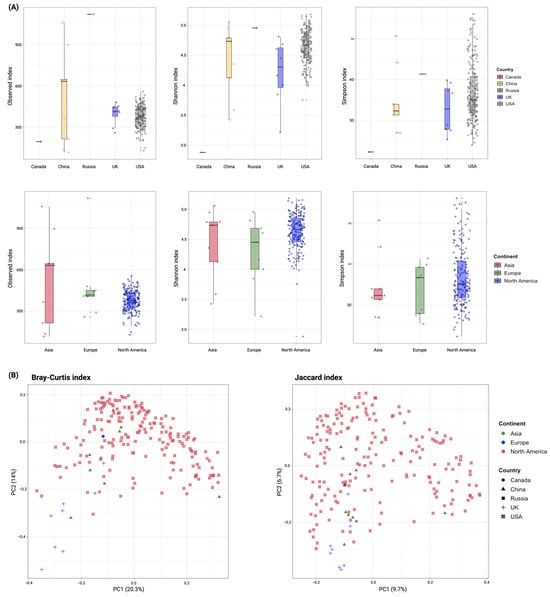 To analyze the diversity of ARGs within each sample, alpha diversity was employed using the Observed, Shannon, and Simpson indices using the microbiome (1.24.0) R package [20]. Moreover, Principal Coordinate Analysis (PCoA) was used to describe the beta diversity of ARGs between different samples by implementing the Bray–Curtis and Jaccard indices using the vegan (2.6.6.1) R package [21]. The permutational multivariate analysis of variance (PERMANOVA) was applied to determine the significance of PCoA distance separation between samples, with a value of R2 0 and a p-value 0.001 considered statistically significant. To identify indicator ARGs for countries and continents, we employed the multipatt function from the indicspecies (1.7.15) R package [22] and stats (4.3.2) [23] R package, utilizing 999 permutations. ARGs with a p-value 0.05 were considered significant indicators. The abundance of identified ARGs and indicator ARGs across different countries and continents was represented as PRKM using the ggplot2 (3.5.1) R package [24].