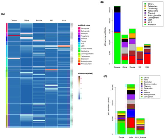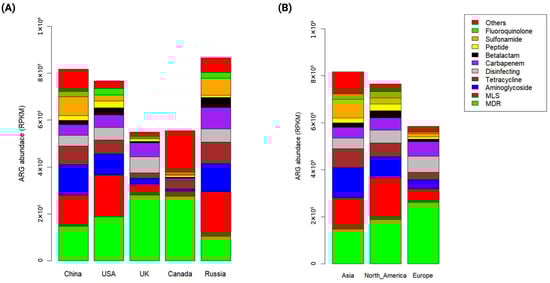 Continently, Asia (represented by China) displayed the highest observed ARGs, followed by Europe and North America, reflecting the pattern observed at the country level, where China (Asia) and Russia (Europe) have the highest observed ARGs. These findings suggest a potential association between the fate of ARGs and population density, possibly attributed to anthropogenic activities in densely populated regions like Russia and China [40,41]. However, North American samples demonstrated a more diverse and even distribution of ARGs, potentially influenced by its larger sample size compared to Asia and Europe.