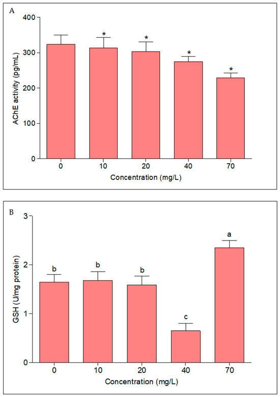 3.4. Acetylcholinesterase (AChE) and Reduced Glutathione (GSH) Activity