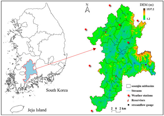 Seomjin River basin including reservoirs, weather stations, streamflow gauge, and Digital Elevation Model (DEM).