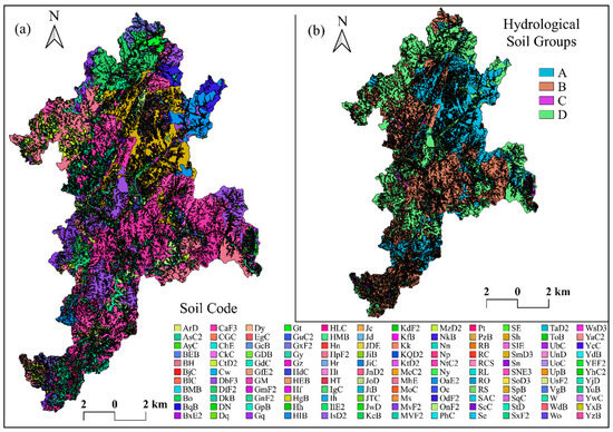 Study region soil classification: (a) soil code and (b) hydrological group.