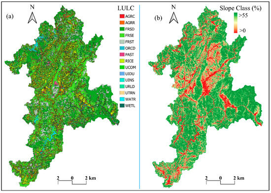 Seomjin watershed: (a) land use and land cover (LULC) classification and (b) slope class.