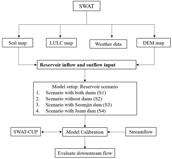 The Seomjin River basin was selected as a case study region to analyze the effects of reservoir operation on the downstream flow. The objectives of this study are (i) to assess the impact of reservoir inflow and outflow on the downstream flow conditions; (ii) to evaluate the effects of individual and combined reservoir flow on the downstream flow of the basin; and (iii) to weigh the parameter sensitivity towards the reservoir scenario of the study watershed. This study provides valuable insight into the simulation of reservoir routing using the SWAT model with daily-recorded reservoir inflow and outflow values. Further, this study highlights the water balance of the Seomjin watershed.