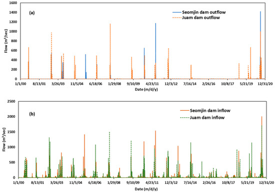 Seomjin and Juam reservoirs: (a) outflow values and (b) inflow values.