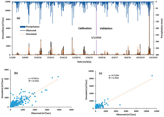 Streamflow: (a) observed and simulated vs. time for calibration and validation periods, (b) observed vs. simulated during calibration, and (c) observed vs. simulated during validation.