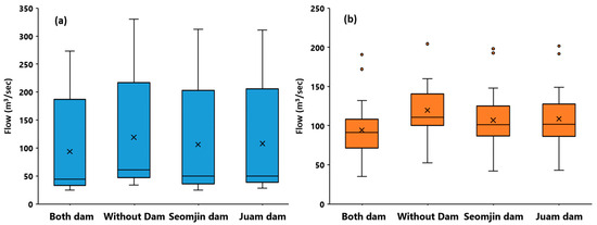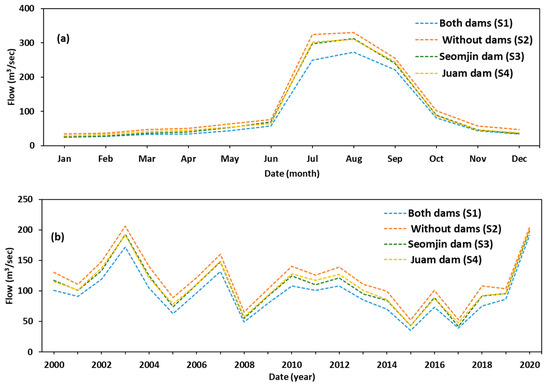 Reservoir operation significantly impacts the downstream flow rate, magnitude, and fluctuation during the dry and wet seasons of the study watershed [43,44]. Figure 7 displays the monthly and annual average downstream flow patterns for each Seomjin River basin reservoir scenario. South Korea experiences the monsoon season from July to September, which brings heavy rainfall, including in the Seomjin River basin. Figure 7 depicts the seasonal flow variations in the study watershed in all reservoir scenarios. For the monthly downstream hydrograph, the maximum flow happened in August for the reservoir scenarios of the study basin, as displayed in Figure 7a. January exhibited a lower flow magnitude for each reservoir scenario, as shown in Figure 7a. The mean monthly flow value ranged from 93.8–119 m3/sec for all reservoir scenarios. In October, all reservoir scenarios showed less discrepancy from the mean monthly range values. In the case of individual reservoir operation, that is, scenarios 3 and 4, the Seomjin reservoir operation (scenario 3) displayed better performance in reducing the downstream flow, as shown in Figure 7a.