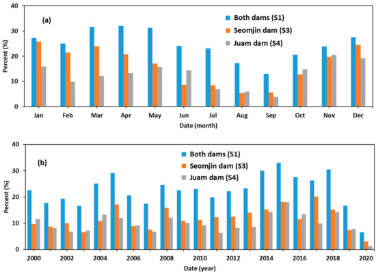 Further, this study analyzed the percentage of flow reduction by comparing scenarios with no reservoir operation to those with reservoir operation in the study basin. Figure 8 illustrates the monthly and yearly percent reduction due to either one or both reservoir operations versus no reservoir operation in the study basin. Scenario 1 exhibits the highest percent flow reduction, about 32%, in April, as depicted in Figure 8a, while the lowest percent (13%) was observed in September. The month of January demonstrated a peak percentage reduction in downstream flow by 25.85%, while a lower percentage decline was observed in August of 5.4% for Seomjin reservoir operation. Scenario 4 exhibits a lower percentage (3.8%) decline in September, with the highest percentage (20.5%) noted in November. The mean monthly flow percent reduction ranges from 12.7 to 24.7% due to reservoir operation in the study basin.
