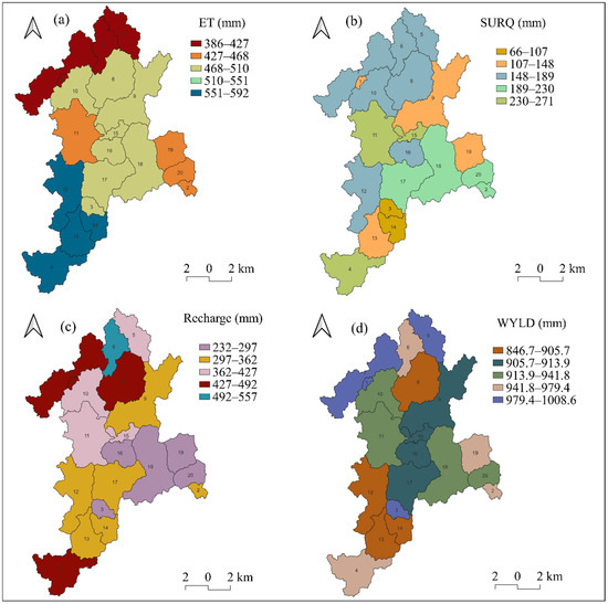 The study watershed hydrological water segments: (a) evapotranspiration (ET), (b) surface runoff (SURQ), (c) recharge, and (d) water yield (WYLD) in mm.
