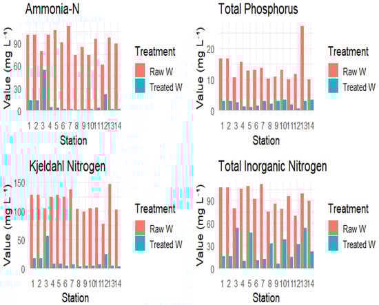 NH3, TP, TIN, and TKN reduction in wastewater treatment process: percentages of removal prior and after purification. (Raw W: raw water, Treated W: treated water).