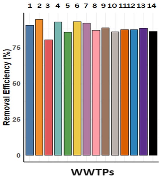 The significant variation in removal efficiencies among the 14 wastewater treatment facilities can be attributed to multiple factors, including variations in plant design, treatment methods, and operational procedures. This variability is consistent with findings from other studies in Europe. For example, researchers found that insufficient maintenance and out-of-date infrastructure led to inefficient performance in 50% of Spain’s small WWTPs [13]. Similarly, other researchers discovered that only 55% of Greece’s small municipal treatment plants met the necessary standards, indicating performance variability across facilities [14].