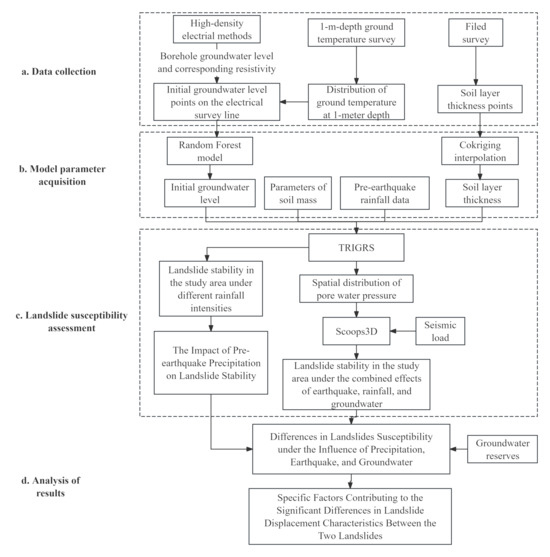 To comprehensively analyze the formation causes of two landslides with significantly different flow characteristics on the same slope in Yongguang Village, this study employed the 1 m temperature method to investigate the distribution of shallow groundwater in the research area. Based on the results of the 1 m temperature method, a regression prediction of the initial groundwater levels was conducted using a combination of random forest modeling and high-density electrical method results. After obtaining accurate hydrological and geotechnical parameters, the TRIGRS model was utilized to assess the impact of actual rainfall on landslide stability. Furthermore, by considering the pore water pressure induced by actual rainfall and groundwater, the Scoops3D model was applied to analyze the stability of the landslides in the study area under seismic influence. The final analysis revealed that, although both landslides occurred on the same slope, the western landslide exhibited flow slides induced by seismic liquefaction, while the eastern landslide demonstrated instability triggered by seismic inertial forces, highlighting the specific influencing factors involved. Figure 2 provides an overview of the research workflow.