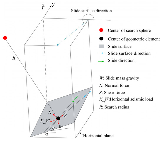 The Scoops3D stability model incorporates seismic loads by defining a horizontal seismic acceleration coefficient (), which is considered a horizontal force acting on the sliding mass. Based on the moment equilibrium of forces acting on the sliding body within the grid cell (Figure 4), the sum of gravitational forces , seismic loads , and tangential forces must equal zero at the center of the sphere. Here, represents the vertical distance from the sphere center to the center of mass of the sliding body, while other parameters are indicated in the illustration.