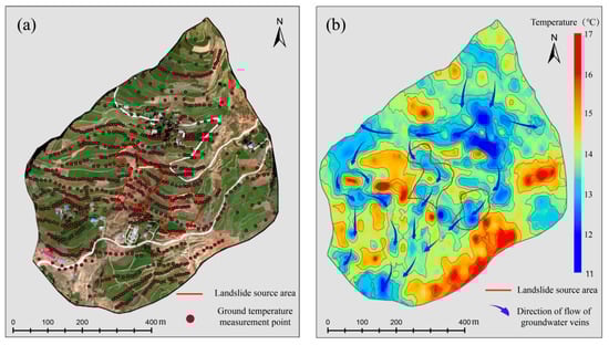 Results of 1 m depth ground temperature survey: (a) distribution of temperature measurement points; (b) distribution of 1 m ground temperature and inferred direction of groundwater flow vein in Yongguang Village.