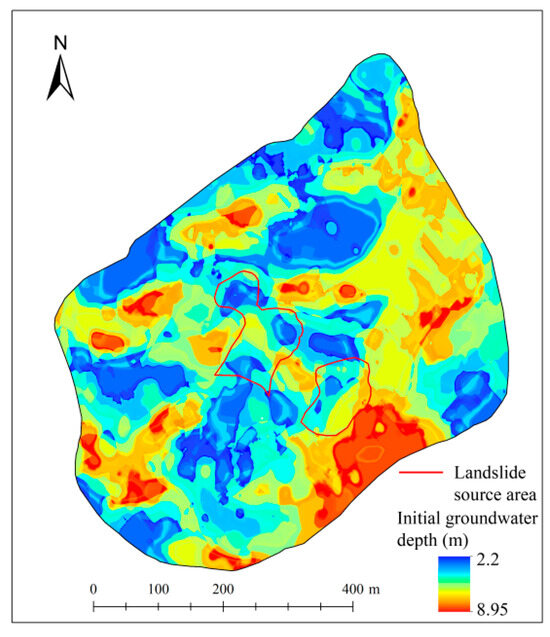 Accurate initial groundwater level information is essential for enhancing the temporal and spatial prediction accuracy of landslides. In this study, we performed a comparative analysis by integrating high-density electrical resistivity inversion data [25] with measured groundwater levels from drilling b and e, which are closest to the survey lines (Figure 6). Based on these data, we inferred that the resistivity near the groundwater levels in the study area ranges from 30 to 40 Ω·m. Using these findings, we extracted 51 initial groundwater depth points as sample data and employed the random forest model to predict the initial groundwater depth distribution across the study area (Figure 7).