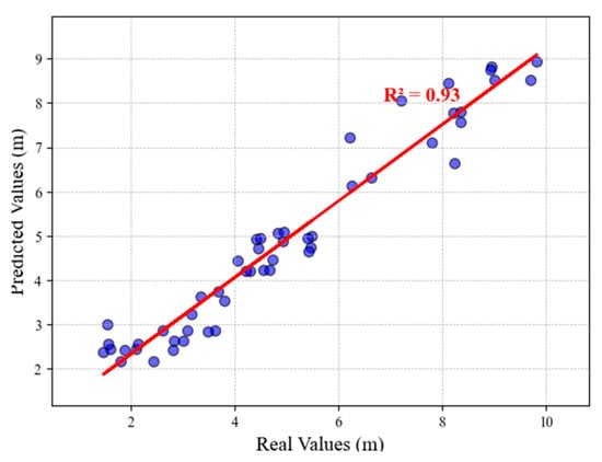 To address potential issues related to insufficient training and validation data, we utilized the Jackknife method in the reliability analysis of the random forest model. Specifically, 90% of the sample points were used as training data, while the remaining 10% served as validation data. This process was repeated 51 times to obtain predictions for all sample points. Ultimately, the coefficient of determination (R2) for the fit between the predicted values derived from the random forest model and the actual values was 0.93 (Figure 8),where the blue dots represent the predicted and actual values for the points used for model validation in each iteration.