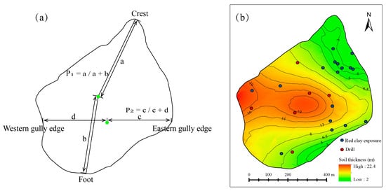 In the TRIGRS model, soil thickness represents the deepest potential failure surface, which is typically the surface with the lowest safety factor. For this study, the soil layer thickness is defined as the distance from the surface to the underlying red clay. Due to intense erosion, fragmented topography, frequent geological disasters, and terracing activities in the study area, numerous red clay exposures were identified. Through field investigations, we obtained 19 soil thickness measurement points, along with 4 borehole data, totaling 23 points of soil thickness. The investigation revealed that the erosion conditions in the study area intensify from west to east, influenced by slope, precipitation, and ancient landslides. Referring to the geomorphological index soil thickness model (GIST) proposed by Catani [36], we selected two auxiliary variables (Figure 9a): the north–south slope position (P1) and the east–west relative position (P2) for co-operative kriging interpolation. This approach yielded a distribution map of soil layer thickness across the study area (Figure 9b). The average standard error of cross-validation was 1.79 m. Although this error is relatively high, it remains acceptable given that the range of actual values spans 22 m.