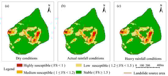This study employed a TRIGRS model to assess the factor of safety (FS) values for each grid cell in the research area under three scenarios (Figure 10): no rainfall, actual rainfall, and heavy rainfall (100 mm/day). The analysis was based on a 10 m resolution digital elevation model (DEM) and precise soil and water parameters. The actual rainfall parameters were set according to data from the nearest automated weather station to Yongguang Village, with an initial rainfall of 3 mm/h for the first 3 h, followed by 1 mm/h for the subsequent 9 h [25]. The FS values were categorized into four levels: high-susceptibility areas, medium-susceptibility areas, low-susceptibility areas, and stable areas. Specifically, when FS is less than 1, the grid is considered extremely unstable and classified as a high-susceptibility area; when FS is greater than 1 but less than 1.2, it is categorized as a moderate-susceptibility area; FS values between 1.2 and 1.5 indicate a low-susceptibility area; and values greater than 1.5 denote a stable condition.