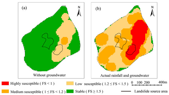 Results of the Scoops3D model: (a) conditions without groundwater; (b) conditions with actual rainfall and groundwater.
