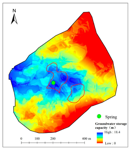 The study area is located in the Longzhong region, where Neogene red clay is widely distributed. The poor cementation of the red clay, combined with a significant cover of loess, results in a typical loess slope primarily composed of loess and red clay. Factors such as topographic gradient and surface lithology influence the weak groundwater recharge in the loess hilly area. The presence of red clay acts as a barrier, causing moisture entering the slope to accumulate at the lithological interface, leading to the formation of a highly saturated soil layer. Therefore, by assuming that the groundwater table is rich in water up to the upper boundary of the red clay layer, the groundwater storage capacity can be calculated by subtracting the depth of the groundwater from the distance between the red layer interface and the surface (Figure 12).