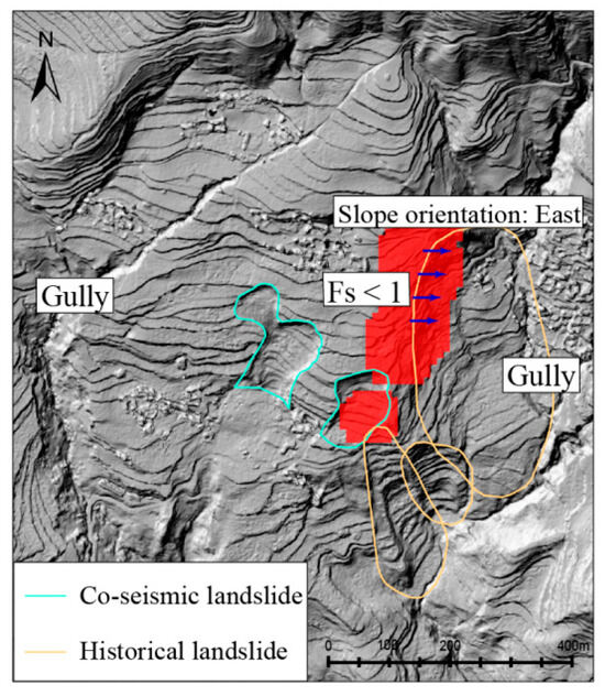 Overlaying the areas with a factor of safety (FS) value less than 1 (red zone), as outputted by the Scoops3D model, with terrain shadow maps and historical landslide data revealed that these areas are primarily concentrated in the eastern part of the study region, characterized by relatively steep slopes (Figure 13). These locations correspond to the rear edges of older landslides, exhibiting favorable conditions for failure but poor stability. Following the actual earthquake, only the eastern landslide area experienced a landslide event. This occurrence can be attributed to the controlling effects of the regional stress field direction, seismic wave propagation direction, and block movement direction, indicating that slope orientation is a significant topographical factor influencing the distribution of earthquake-induced landslides. According to Tian Yingying [41], the dominant slope orientations for landslides triggered by the 2013 Min County earthquake in Gansu Province were SE, S, and SW. In contrast, the slope orientation of the high landslide-prone area in the eastern region, which was not situated in a landslide source area, is E. Therefore, the absence of landslides in this area may be attributed to its slope orientation.