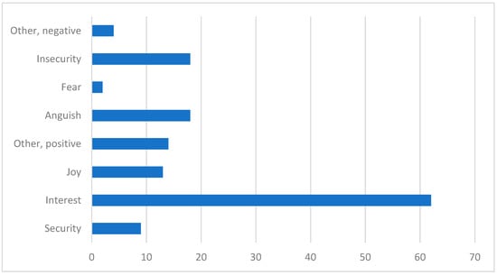 The entry most picked, regarding feelings towards A.I., was “interest”, followed by “anguish” and “insecurity”. There were 98 positive entries, compared to 42 negative ones (Table 7 and Figure 3).