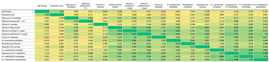 As depicted, viewing A.I. as a partner rather than a competitor and being interested in being briefed about A.I. had the highest statistical difference for gender. For age groups, most variables had high and comparable scores, with interest in being briefed about A.I. being the highest again. For education level, integration into curricula had the highest statistical difference, followed by interest in being briefed about A.I. and A.I. contribution to knowledge. Lastly, for specialty, A.I. contribution to development, followed by viewing A.I. as a partner rather than a competitor and A.I. contribution to knowledge, had the highest statistical difference.