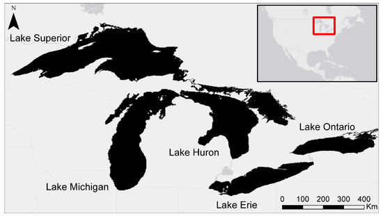 The study area for this work included all five of the Laurentian Great Lakes, including Lakes Erie, Huron, Michigan, Ontario, and Superior (Figure 1).