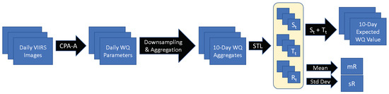 This approach provides products that are well-suited for inclusion in a dashboard or as part of a decision support system. A recent dashboard, resulting from an international collaboration between NASA, ESA, and JAXA, allowed users to view how a suite of satellite-observable parameters (including the Great Lakes water quality parameters presented here) were impacted by the COVID-19 shutdowns. A similar dashboard, divorced from the COVID-19 forcing event, could be valuable for users who are interested in exploring Great Lakes water quality data and how it might be impacted by other potentially important events, e.g., a major storm, a mild winter, or upwellings. The STL algorithm is also relatively efficient, making it reasonable to dynamically build and decompose a time series on-demand for custom-selected regions if a user is not interested in gridded data. This approach could inform the development of physical models, fuel investigations into drivers of water quality anomalies, and help to identify areas that may be experiencing water quality shifts in order to guide future monitoring efforts.