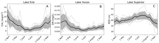 Lake-wide average seasonal time series for Lake Erie CHL (panel (A)), Lake Huron SM (panel (B)), and Lake Superior PZD (panel (C)). Each panel shows the annual seasonal patterns as light gray lines, the 11-year mean as a black line, and the 11-year standard deviation in the gray window.