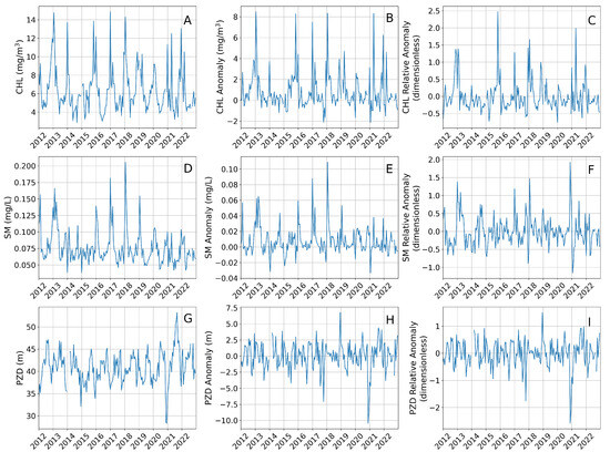 Lake-wide average time series are shown for the three example parameters: Lake Erie CHL (panels (A–C)), Lake Huron SM (panels (D–F)), and Lake Superior PZD (panels (G–I)). The panels in the left column show the parameter value time series. The panels in the center column show the absolute anomaly (A) time series. The panels in the right column show the relative anomaly (rA) time series.
