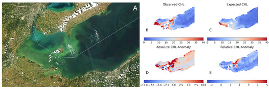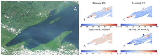 Western Lake Erie harmful algal bloom case study from 22 September 2015. Panel (A) shows the VIIRS true color image, with panel (B) showing the CPA-A derived CHL for the image. Panel (C) shows the expected CHL for this date based on the STL decomposition. Panels (D,E) show the absolute and relative CHL anomaly maps, respectively.