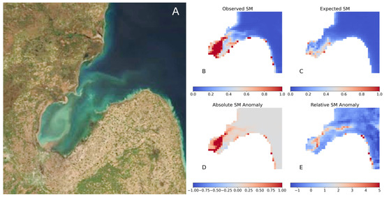 A 500-year flood event occurred in mid-Michigan from 17 to 20 May 2020. As a result, significant levels of river discharge entered the Great Lakes, particularly Saginaw Bay. In the satellite image from 21 May 2020 (Figure 6A), there is heavy turbidity throughout Saginaw Bay, including a clear sediment-dominated plume coming out of the Saginaw River and extending into Lake Huron. While the absolute anomaly map (Figure 6D) indicates a strong SM anomaly throughout Saginaw Bay, the rA map (Figure 6E) more precisely identifies the flood-influenced river plume.