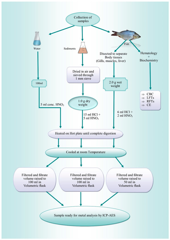 Two fish species [B. bagarius (30–37 cm, 210–265 g) and B. marinus (27–30 cm, 190–210 g)] were considered for sampling because of their consumption rate and presence/easy availability, irrespective of their sex and age. Triplicate samples of sediments, water, and fish were taken from pre-selected locations upstream and downstream of the Jhelum River. With the assistance of fishermen, a total of 12 fish were gathered from two distinct sites along the Jhelum River in the district of Khushab. Six samples from each site were then taken to the lab for heavy metal analysis. In the laboratory, each sample was cleaned and labelled. Portions of fish tissues (gills, liver, and muscles) were then taken out by dissecting the fish and were stored in zip lock bags and labelled. Tissues were stored at −20 °C until further analysis of the hematological and biochemical profile. The sampling was carried out in January and February of 2023. Figure 1 shows sample collection, preparation, and analysis in brief.