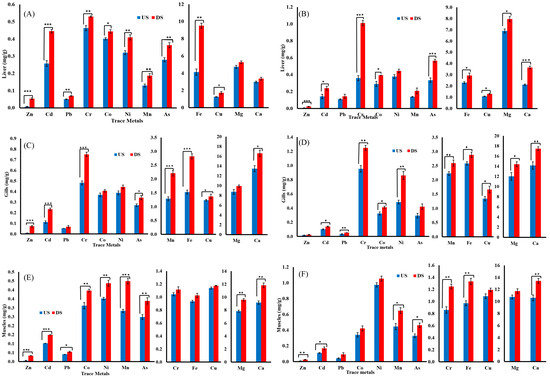 Heavy metal concentrations in (A) water and (B) sediment; data presented as Mean ± SE; significant difference among sites is represented by asterisks (two-sample t-test, p < 0.05 = *, p < 0.01 = **, and p < 0.001 = ***). Heavy metal concentrations in tissues of (C) B. marinus (upstream), (D) B. marinus (downstream), (E). B. bagarius (upstream), and (F) B. bagarius (downstream); data are given as Mean ± SE and superscripted letters on bars show significance difference at p < 0.05 (ANOVA followed by LSD).