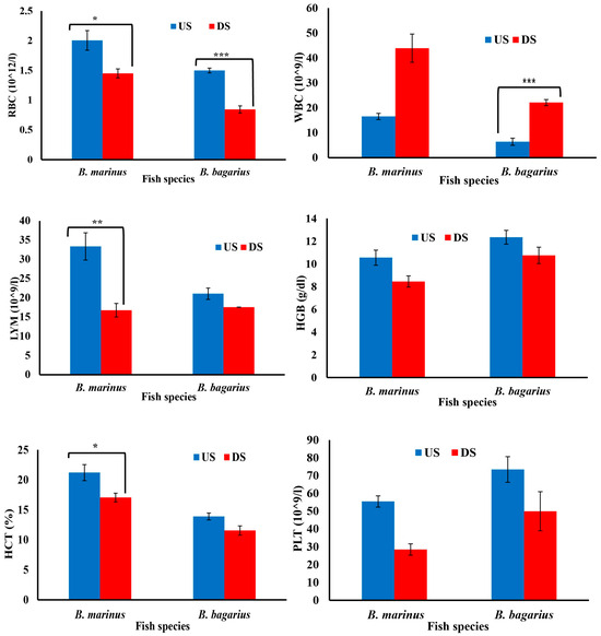 Hematological profile of Bagre marinus and Bagarius Bagarius from upstream (US) and downstream (DS) of Jhelum River in Khushab District. Data represented as Mean ± SE. Significant difference among sites is represented by asterisks (two-sample t-test, p < 0.05 = *, p < 0.01 = **, and p < 0.001 = ***).