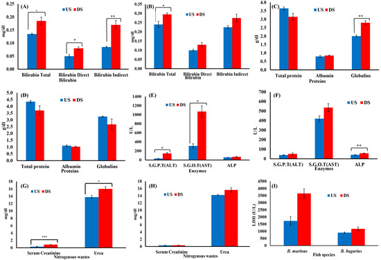 Serum biochemical profile of Bagre marinus and Bagarius bagarius from upstream (US) and downstream (DS) of Jhelum River in Khushab. (A) Bilirubin for B. marinus, (B) bilirubin for B. bagarius, (C) protein for B. marinus, (D) protein for B. bagarius, (E) enzymes for B. marinus, (F) enzymes for B. bagarius, (G) nitrogenous wastes for B. marinus, (H) nitrogenous wastes for B. bagarius, and (I) LDH for both species. Data presented as Mean ± SE. Significant difference among sites is represented by asterisks (two-sample t-test, p < 0.05 = *, p < 0.01 = ** and p < 0.001 = ***).