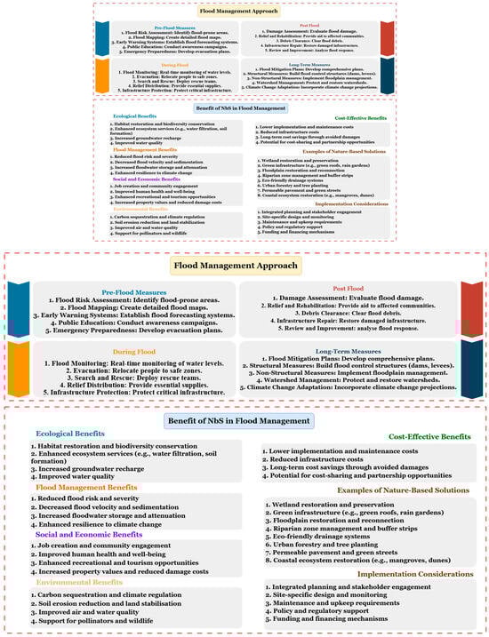This survey provides an organised summary of flood management strategies and NbS advantages. The four stages of flood management are described as follows: pre-flood (risk assessments, mapping, and preparation), during the flood (protection, monitoring, and evacuation), after the flood (rehabilitation and damage assessment), and long-term measures (mitigation plans and structural improvements). Ecological (biodiversity preservation, groundwater recharge), flood management (risk reduction, increased resilience), socio-economic (job development, tourism), and environmental (carbon sequestration, soil stability) benefits are the categories under which NbS benefits fall. Examples of NbS are highlighted, including wetlands, green roofs, permeable surfaces, and their financial benefits (shared funding opportunities and reduced expenses). For implementation to be successful, integrated planning, upkeep, and regulatory support are needed.