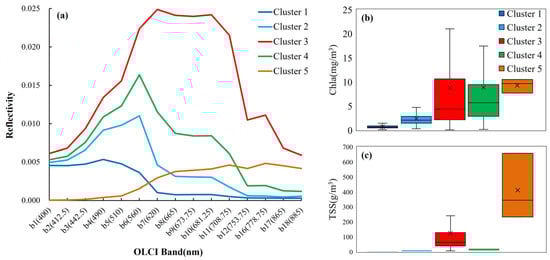 (a) Average spectral curve of each category. (b) Chla concentration distribution of different clusters. (c) TSS concentration distribution of different clusters.
