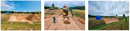 The shape of a levee is one of the important geometric factors affecting its failure due to seepage and overtopping. To verify whether the levee was constructed in a similar form, the images captured by a drone just before overtopping in the experiment that did not consider seepage [3] and those in the experiment that considered seepage [4] were compared. The results were compared with the condition of the levee before the experiment was conducted. The levee constructed in 2023 [4] had the same height, width, length, and side slope as the one tested in 2021 [3]. However, in the 2023 experiment, the waterside land was approximately 0.5 m higher than the protected lowland, in contrast to the 2021 experiment, resulting in levees with different lengths on both sides. Furthermore, the analysis of the point cloud generated using drone footage confirmed that the construction of the two levees was very similar (Figure 2). Additionally, the 2021 experiment confirmed that the shape of the levee constructed based on the comparison of the volumes of the two levees, excluding the waterside land slope, was very similar, enabling the comparison of seepage influence on overtopping and breaching (Table 1).