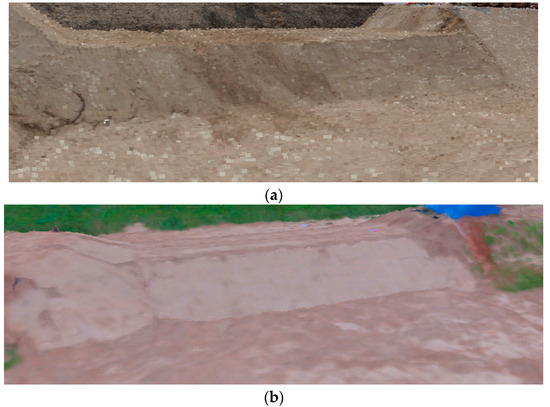 (a) Point cloud results generated from experimenting on the overtopping and breaching of a sand levee in 2021 [3] using imagery prior to overtopping, and (b) comparison of point clouds generated from experimenting on the seepage of a sand levee in 2023 [4] using imagery prior to overtopping and breaching.