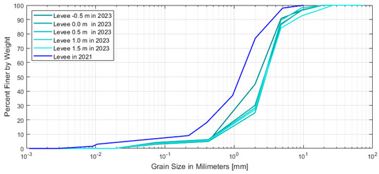For the levee constructed for the experiments in this study, the soil of the embankment was sampled twice each at −0.5, 0, 0.5, 1.0, and 1.5 m based on the height of the levee in the protected lowland. Subsequently, the grain size and physical properties were analyzed. The grain size of the embankment, which affects levee seepage and overtopping stability, was made up of fine-grain sand (SC) with particles smaller than those used in the 2021 experiment. The sand used in the 2023 experiment primarily comprised clean sand (SW) with good grain size (Figure 3).