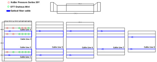 In the 2021 experiment, sand levee failure caused by lateral overtopping was induced by a flow rate of approximately 4 m3/s. To calculate the flow rate of overtopping, the water levels at the upstream and downstream points of the levee were directly measured using an acoustic Doppler current profiler (ADCP). This study initially induced seepage within a specific interval of the levee for approximately 2 d and measured the corresponding flow rate by installing an ADCP (SL-2000) upstream of the levee. During the experiment conducted to test the levee failure caused by overtopping after seepage, the flow rate was measured using the same measurement method as in previous experiments [3]. Moreover, 7 digital pressure gauges (KELLER Pressure Series 26Y, Keller 26Y, KELLER, Switzerland) and 11 pressure-based water level loggers with built-in pressure sensors (OTT Orpheus Mini Water Level Logger, OTT, OTT hydromet, Ludwigstrasse, Germany) were installed 0.5 m below the levee, along with a distributed optical fiber cable in the protected lowland to monitor seepage in the levee (Figure 4).