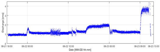 Figure 5 depicts the results obtained from the measurements using the ADCP-SL installed upstream of the levee from 6 PM on 21 August 2023 until 1 PM on 23 August 2023, which was the end of the experiment.