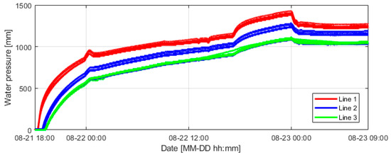 From the time water was supplied until 9 AM on 23 August 2023, seepage occurred in the levee for approximately 37 h at a flow rate of 1–2 m3/s. When seepage occurs in a levee, it causes an increase in the hydraulic pressure. Figure 6 depicts the variations in the water pressure measured using the Keller 26Y and OTT at Lines 1, 2, and 3, which were located 4, 10, and 12 m, respectively, from the waterway.