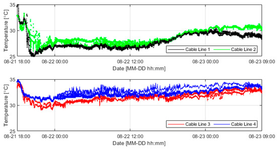 The active method, i.e., the supply of constant heat flux, was used to monitor the temperature changes inside the levee. Figure 8 presents the measurement results in the layer 0.5 m below the bottom of the protected lowland. In the case of the passive method, i.e., without heat supply, temperature changes due to various environmental factors, such as external temperature and soil moisture, require post-processing of the measurement results [4]. In the active method, the constant supply of heat enables the direct confirmation of the temperature decrease caused by water seepage. However, additional water flow was supplied at 3 a.m. on 22 August 2023 and, thus, the temperature changes could not be confirmed in the section where water pressure increased as a result of the seepage inside the levee. Therefore, simple temperature-based monitoring is not the preferred method for levee management.