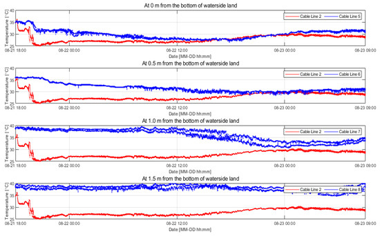 In this layer (0.5 m below), temperature changes occurred almost immediately, unlike the changes in water pressure. Despite slight variations, the temperature decreased without any significant differences as the distance increased from the waterway. Furthermore, temperature variations at different heights remained unchanged at Line 1, which is the closest to the waterway (Figure 9).
