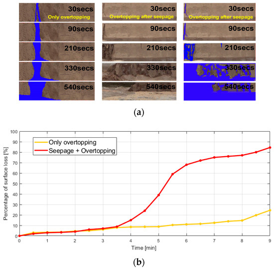 (a) Image analysis results of the levee failure process and (b) comparison of the levee surface loss.
