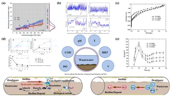 Study on factors affecting methane production in sewers. (a) Statistical correlations between both sewer CH4 and CO2 emissions and overlying sewage COD in a field survey [24]. (b) Comparison of CH4 emissions at the end of sewage pipe networks between summer and winter [27]. (c) Changes in dissolved oxygen in biofilms with biofilm thickness, COD = 400 mg/L [28]. (d) H2S production, CH4 production, and cell viability, where sewer biofilms were subjected to pH levels of 10.5, 11.5, and 12.5, respectively, for 6 hb [29]. (e) Variation in biomass density at different wall shear stresses; COD = 400 mg/L (F means wall shear stress, Pa) [28].