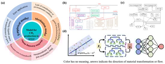 Sewage network-related model. (a) Model defects. (b) Gas generation mechanism [9,53]. (c) Organic matter transformation in a sewage network [54]. (d) Machine learning model with different principles [7].